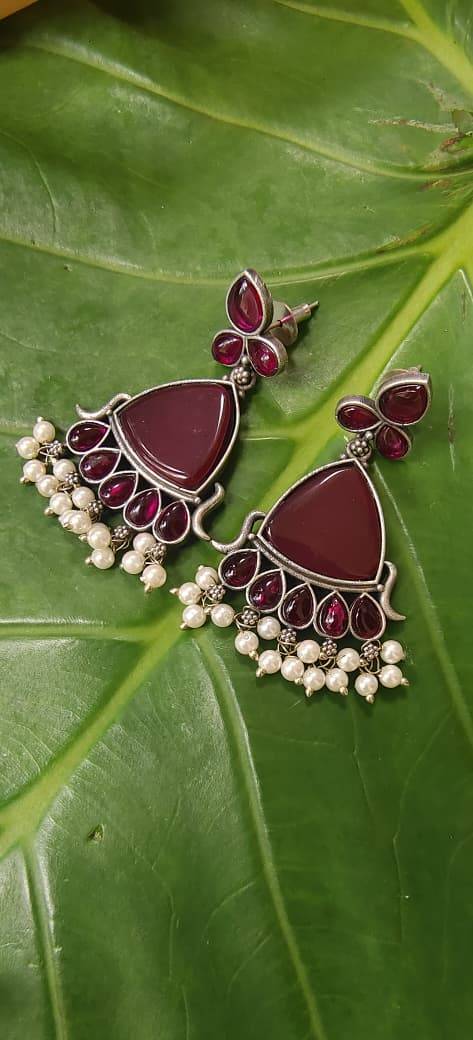 These earrings are a beautiful pair of oxidised silver jhumkas with a contemporary touch. They feature large triangular gem stone centers with a glossy finish, framed by smaller teardrop-shaped stones. The top portion is adorned with a floral cluster of three gem stones, adding elegance to the design. A fringe of delicate white pearls at the bottom enhances their charm, giving them a graceful traditional appeal. Perfect for festive wear or ethnic outfits, these earrings blend modern stonework with classic detailing.