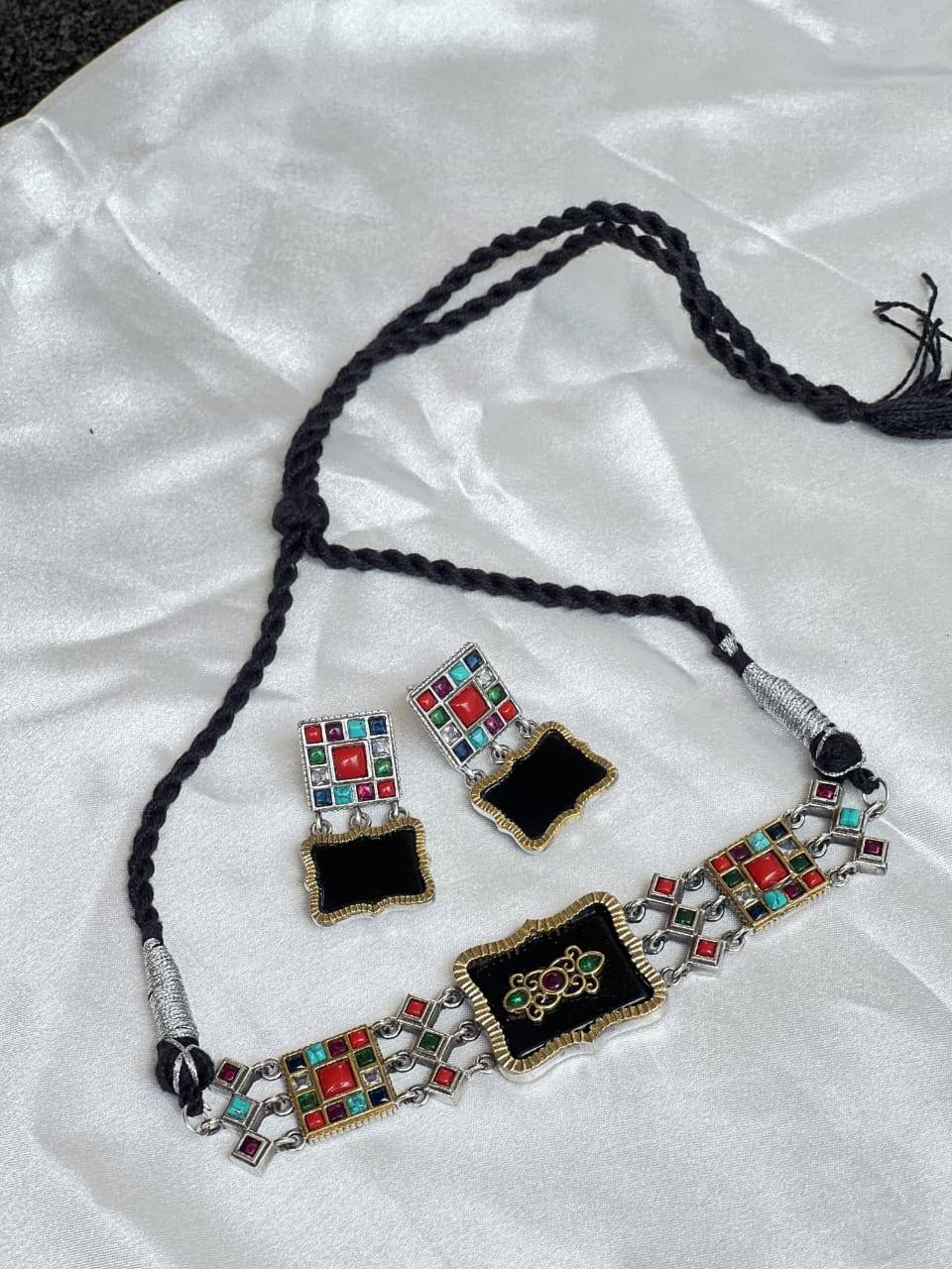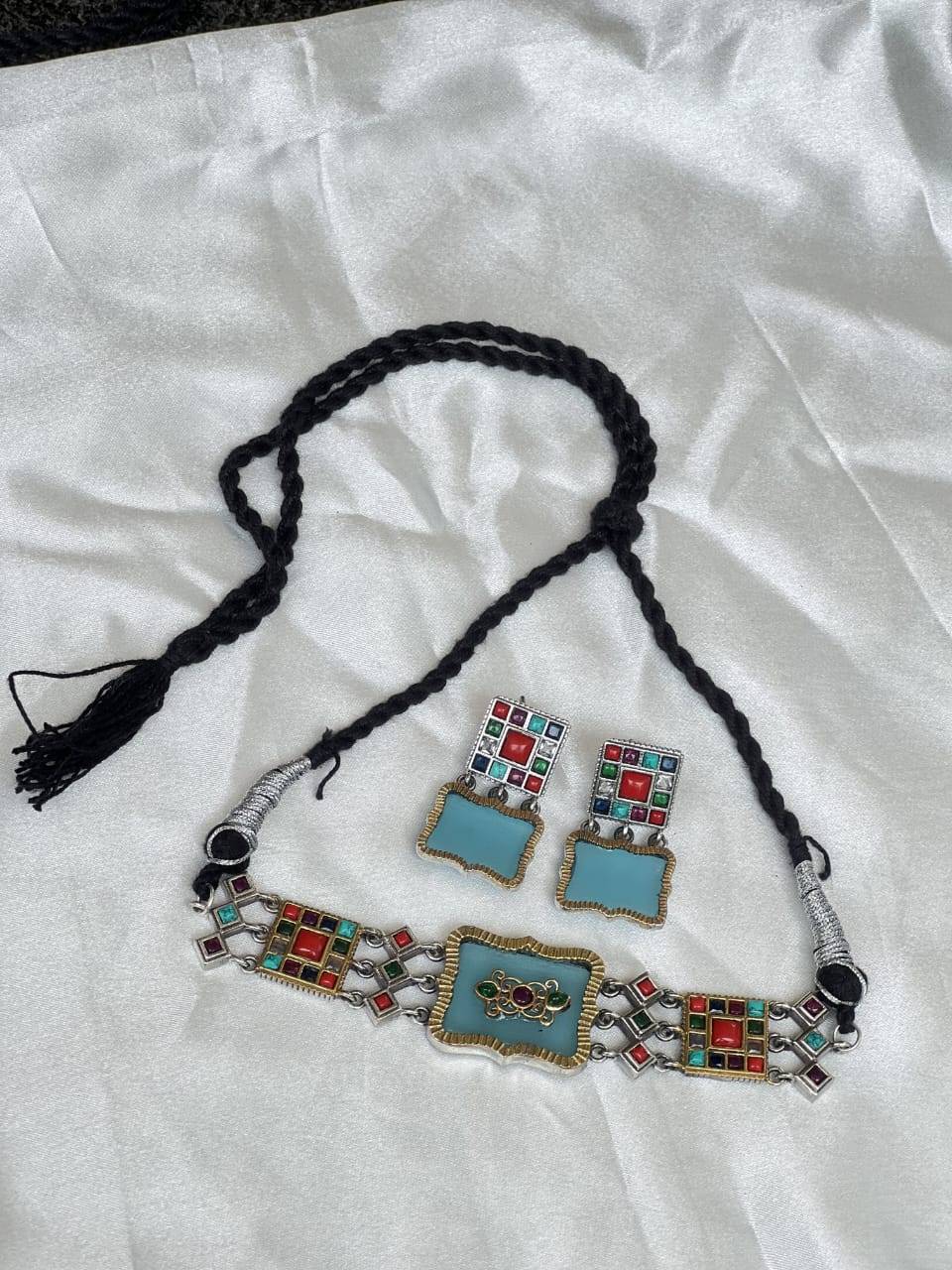 The necklace features a central rectangular pendant with a floral-like design surrounded by colorful square and diamond-shaped stones. The main part of the choker is a flat metal piece with an antique, dark finish, and it's attached to a thick, braided black cord for adjustable length. The earrings mirror the design of the necklace, with a similar colorful, square-and-diamond stone pattern at the top and a larger, solid light-blue rectangular drop below. They have a post or hook for wearing. The overall style is bohemian or traditional ethnic, often associated with South Asian or tribal aesthetics.ù