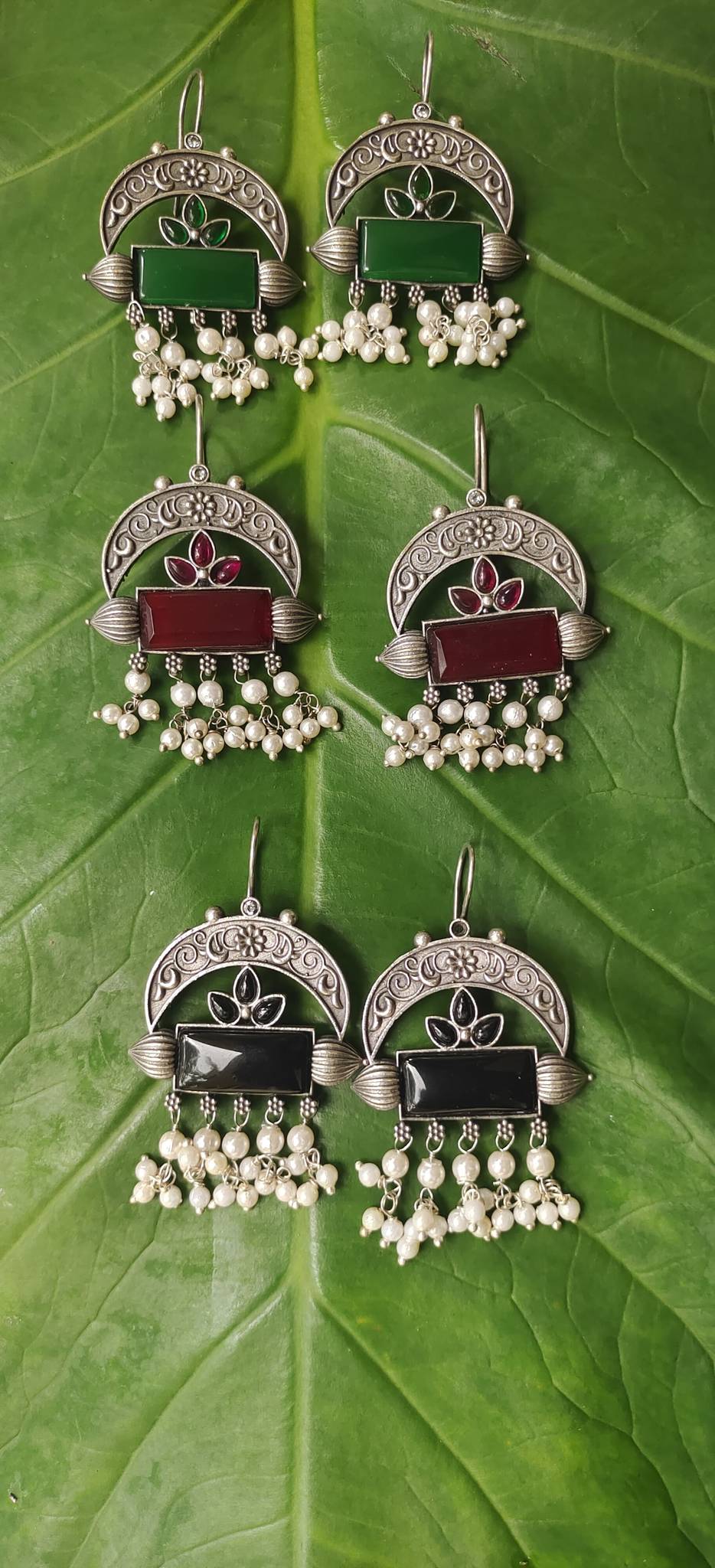 A fusion of tradition and elegance, these oxidised silver earrings feature a crescent-inspired design with floral accents and rectangular gemstone inlays. Finished with delicate pearl danglings, they sway beautifully with every movement, making them perfect for festive wear or ethnic ensembles.
