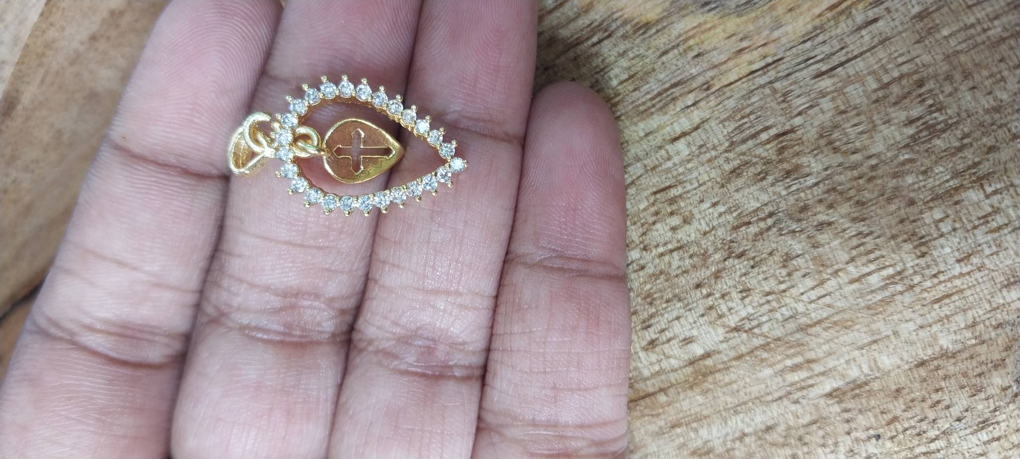Cross Locket A tear-drop shaped gold locket bordered with shimmering stones, carrying a neatly cut cross symbol—perfect for a graceful, meaningful daily wear.