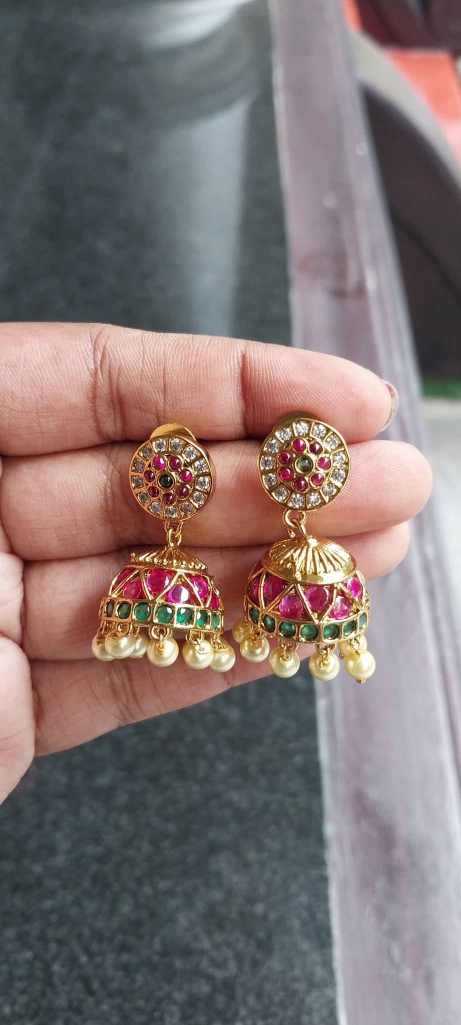 Add a pop of color to your festive look with these Rangriti Kundan Jhumkas. Designed in rich gold tones, the earrings feature a circular stud adorned with sparkling white and ruby red stones, followed by a dome embellished with green and pink Kundan work. Finished with delicate pearl drops, these jhumkas bring together tradition and vibrance — perfect for pairing with sarees, lehengas, or festive ensembles.