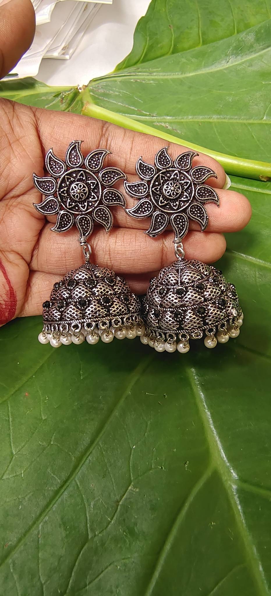 Inspired by the radiance of the sun, these oxidised silver jhumkas feature a stunning sunburst motif at the top with intricate detailing. The dome-shaped jhumka is adorned with fine carvings, black stone accents, and delicate pearl danglings that add a graceful finish. Perfect to pair with both traditional and fusion outfits, these earrings are a timeless blend of elegance and heritage